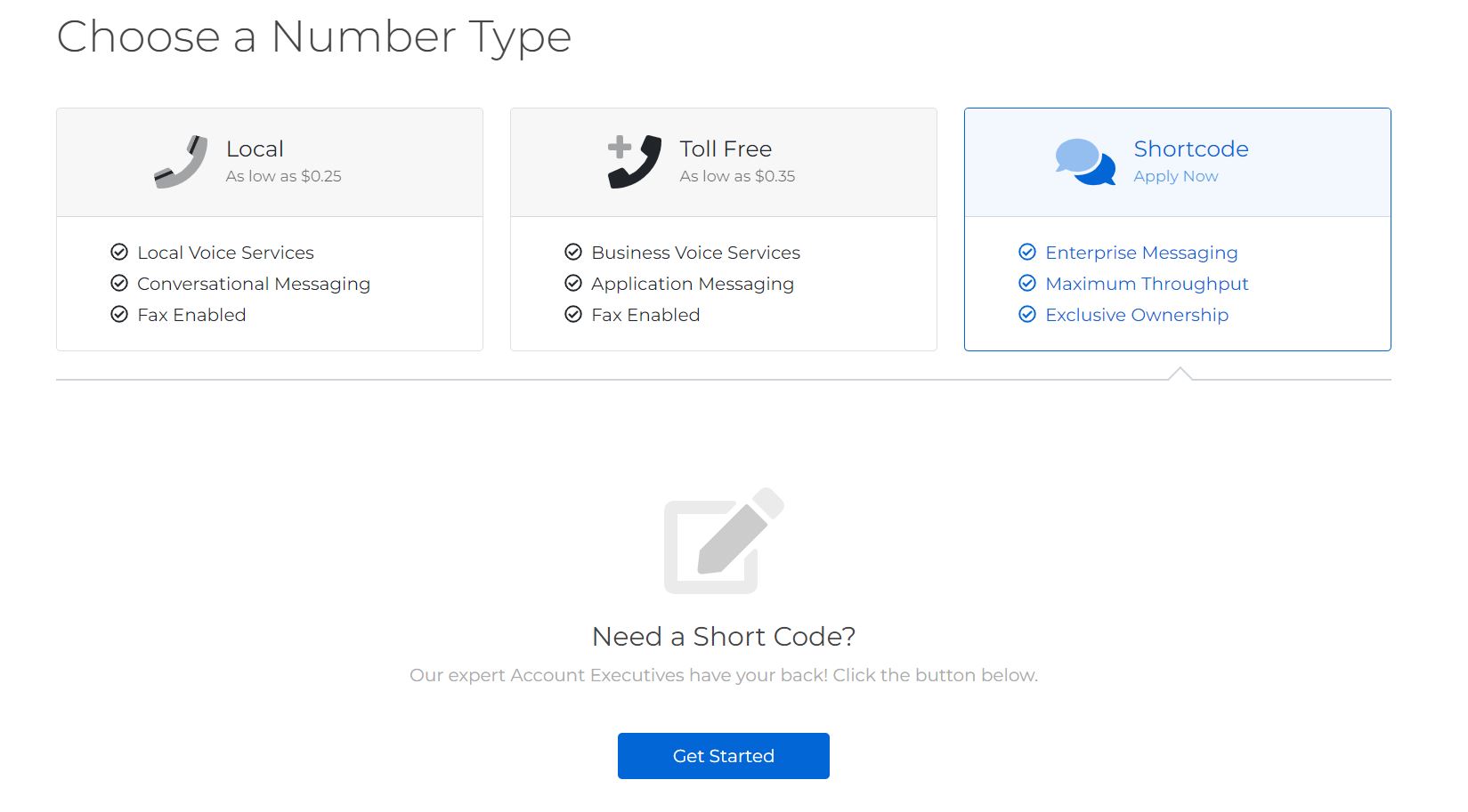 Search, filter, and purchase Local, Toll-Free, or Shortcode numbers in the Dashboard.